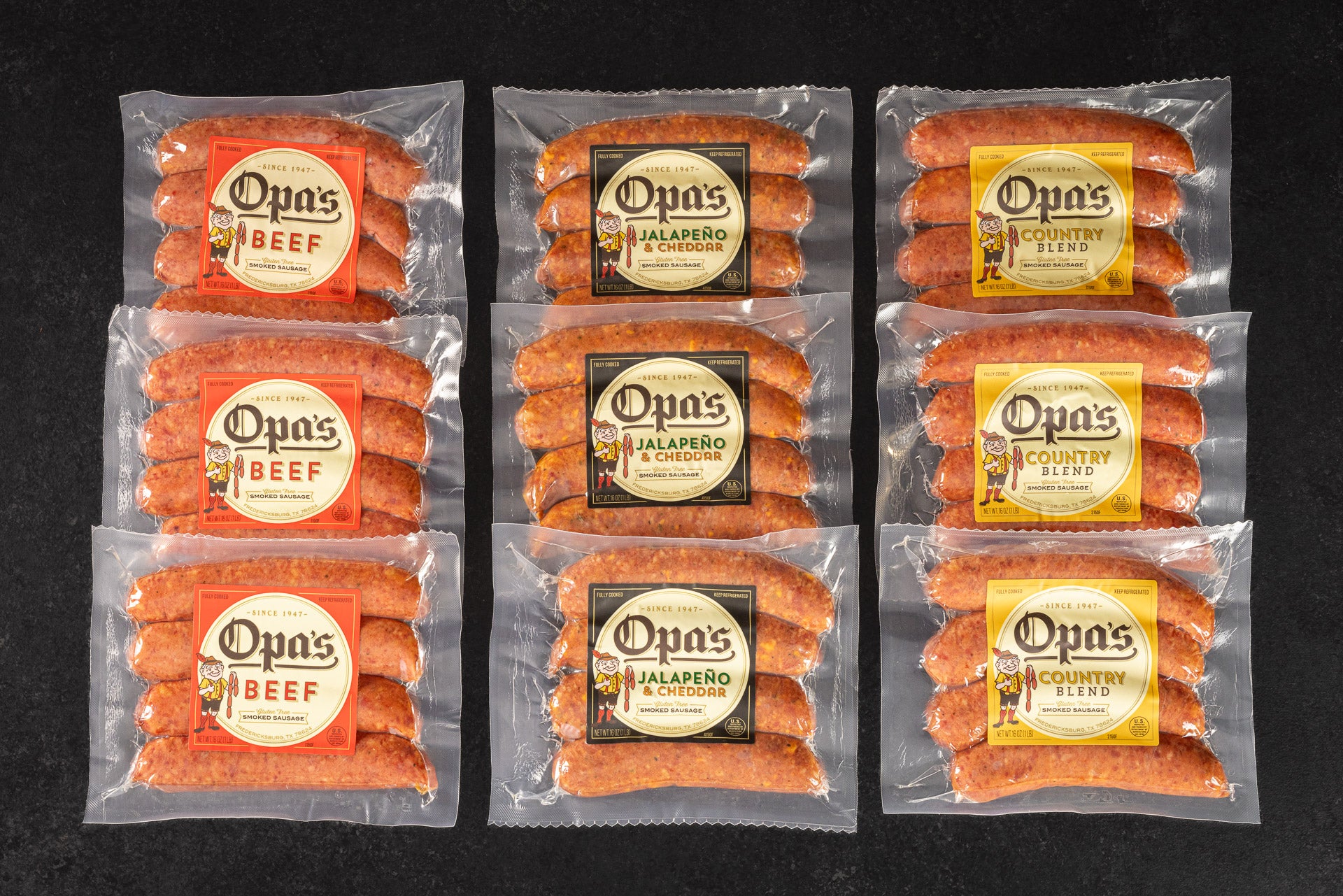 A generous selection of our most popular sausages. Three pounds each of our classic Country Blend, traditional Beef, and beloved Jalapeño Cheddar varieties. Perfect for large gatherings or keeping your favorite Opa's selections always on hand.